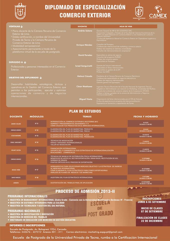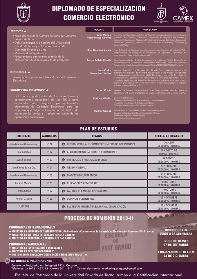 Escuela de Post Grado, Av. Bolognesi 1924, Cercado - Tacna Rectorado, Av. Bolognesi Nº 1177 Tacna. Central Telef. 52 427212 Telefax. 052-242676 - Correo electrónico: postgrado@upt.edu.pe