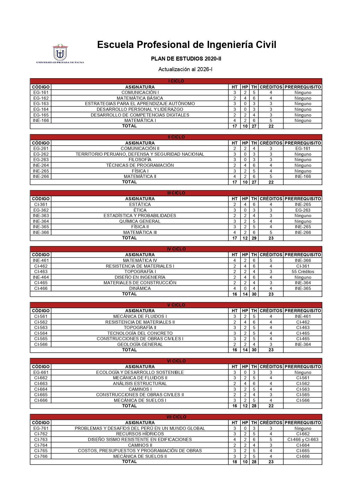 El plan de estudios del Programa de Ingeniería Civil se compone de diez ciclos académicos con un total de 220 créditos. Los cursos incluyen clases teóricas, experiencias de laboratorio, el diseño y la práctica supervisada y no supervisada. Un crédito equivale a una hora de clase teórica o dos horas de práctica. Cada ciclo académico incluye cinco o seis cursos y consta de 17 semanas de clases.