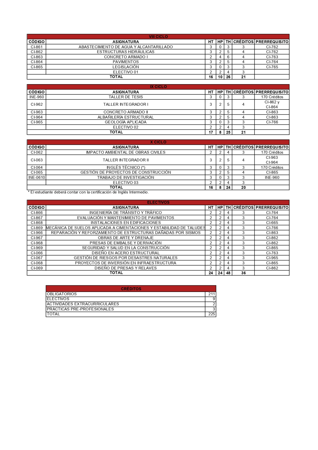 Para graduarse, los estudiantes están obligados a completar los diez ciclos académicos del plan de estudios, contar con estudios de inglés básico, intermedio y avanzado, así como tres meses de prácticas pre profesionales que equivalen a 3 créditos, en cualquier empresa relacionada con el ámbito de la Ingeniería Civil.