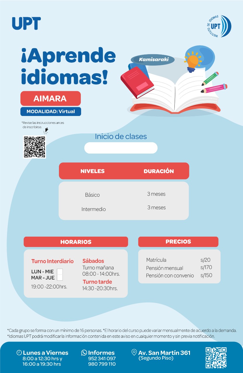 - El curso de aimara tiene una duración de 6 meses hasta el nivel intermedio.