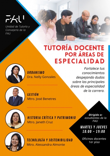 La Unidad de Tutoría y Consejería de la FAU, a través del Programa de Tutoría Docente, extiende sus funciones en beneficio de la comunidad universitaria a través de la TUTORÍA DOCENTE POR ÁREAS DE ESPECIALIDAD DE LA ARQUITECTURA, fortalece tus conocimientos despejando dudas sobre las principales áreas de especialidad de la carrera.