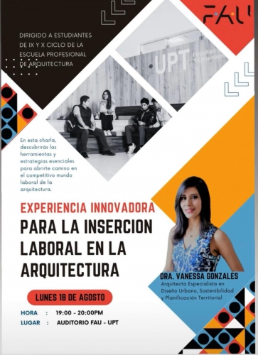 En esta charla, descubriras las herramientas y estrategias esenciales para abrirte camino en el competitivo mundo laboral de la arquitectura, en esta charla contamos con la Dra. Vanessa Gonzales (Arquitecta Especialista en Diseño Urbano, Sostenibilidad y Planificación Territorial).
