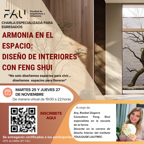 Charla a cargo de la Arq. Rosibel Zegarra Consultora Feng Shui, especialista en la escuela de la forma y Docente en la carrera de Diseño Interior del Instituto TOULOUSE LAUTREC